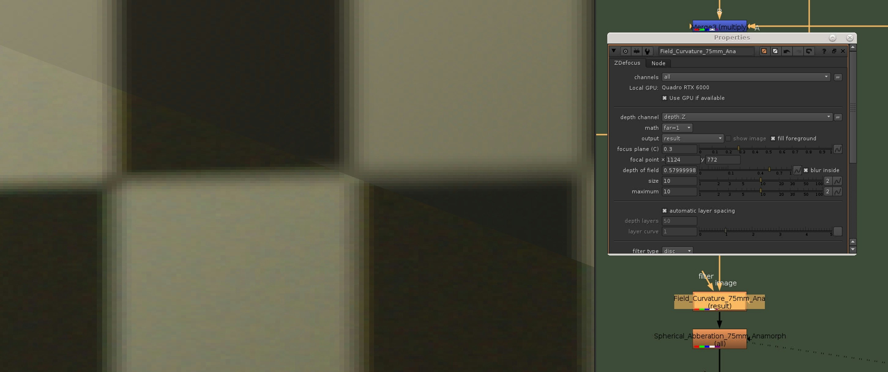 The next step is to check the center of the lens grid, zooming in and recreating the blur amount there with a defocus node. Checking at the edges of the image would result in the spherical abberations and the field curvature adding up, that is not what we want.