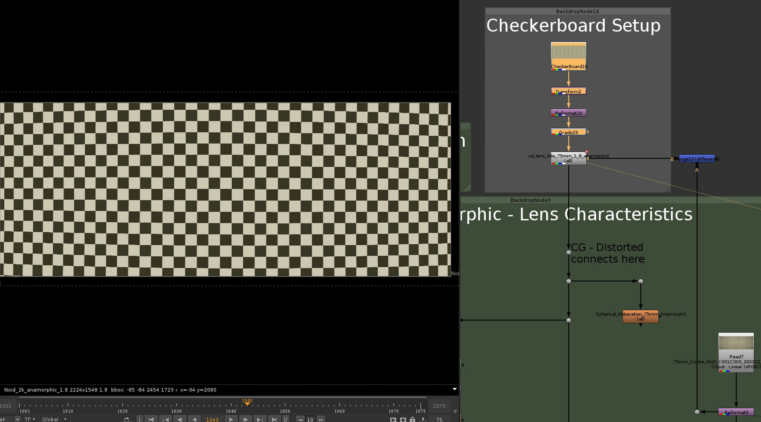Last step is to apply the lens distortion to the nuke checkerboard. We got 3D Equalizer Nuke nodes back from our friends at Track VFX (great tracking company by the way), that is what you can see in the Setup.