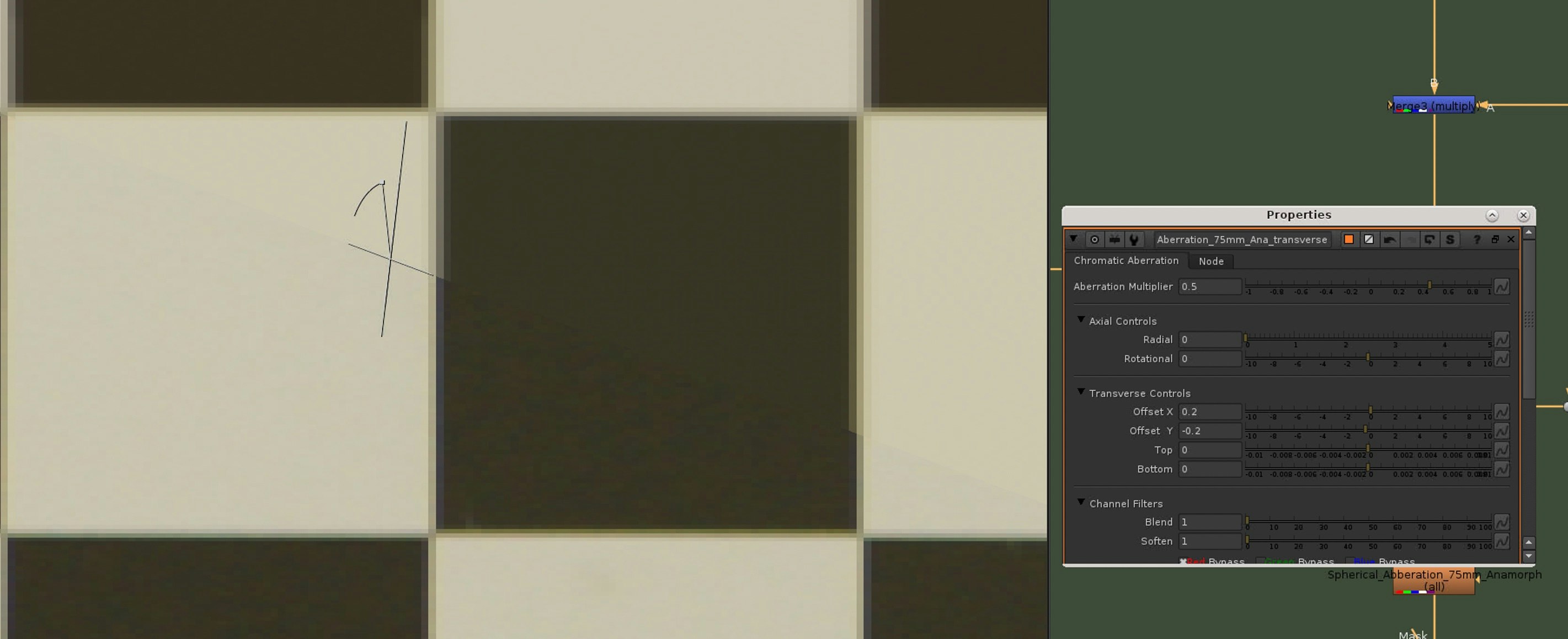 Since the vignetting of a lens is only visible on the edges of the image the center of the blurred lens grid should be white now and the edges should have a radial gray gradient. The result can be multiplied with our clean checkerboard (merge node).