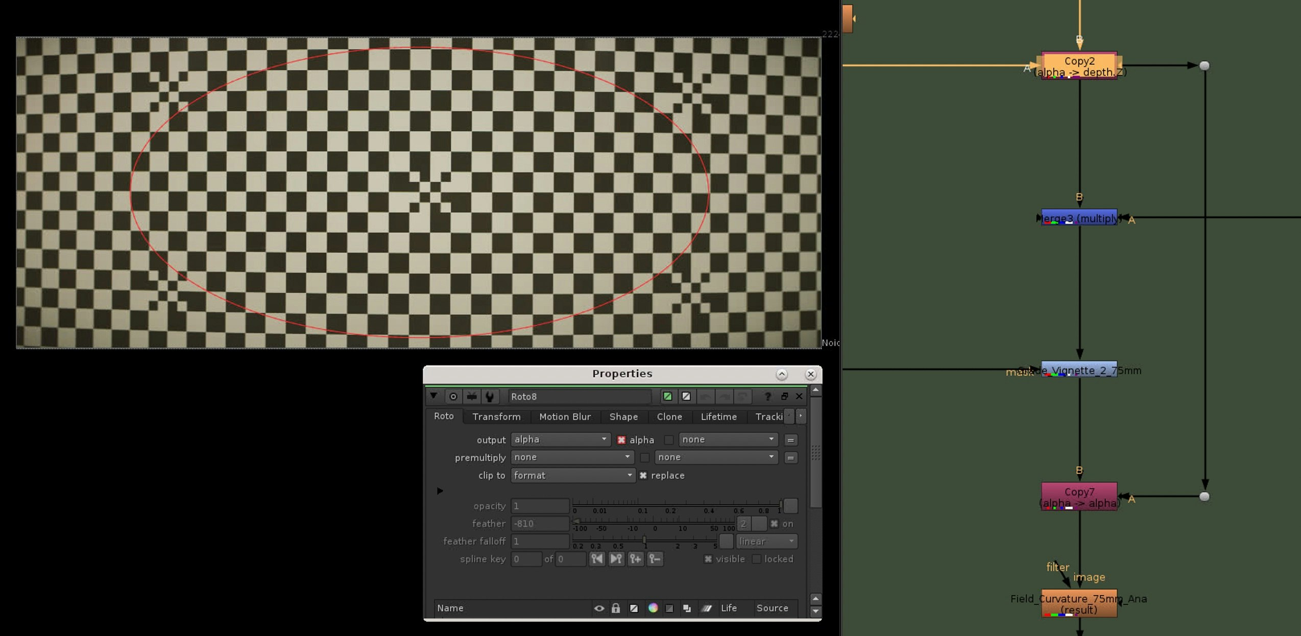 First I am checking where the field curvature starts to kick in on the lens grid by zooming in and going from the center horizontally to the edge. When I found that area roughly I am creating a roto shape covering those boundaries.