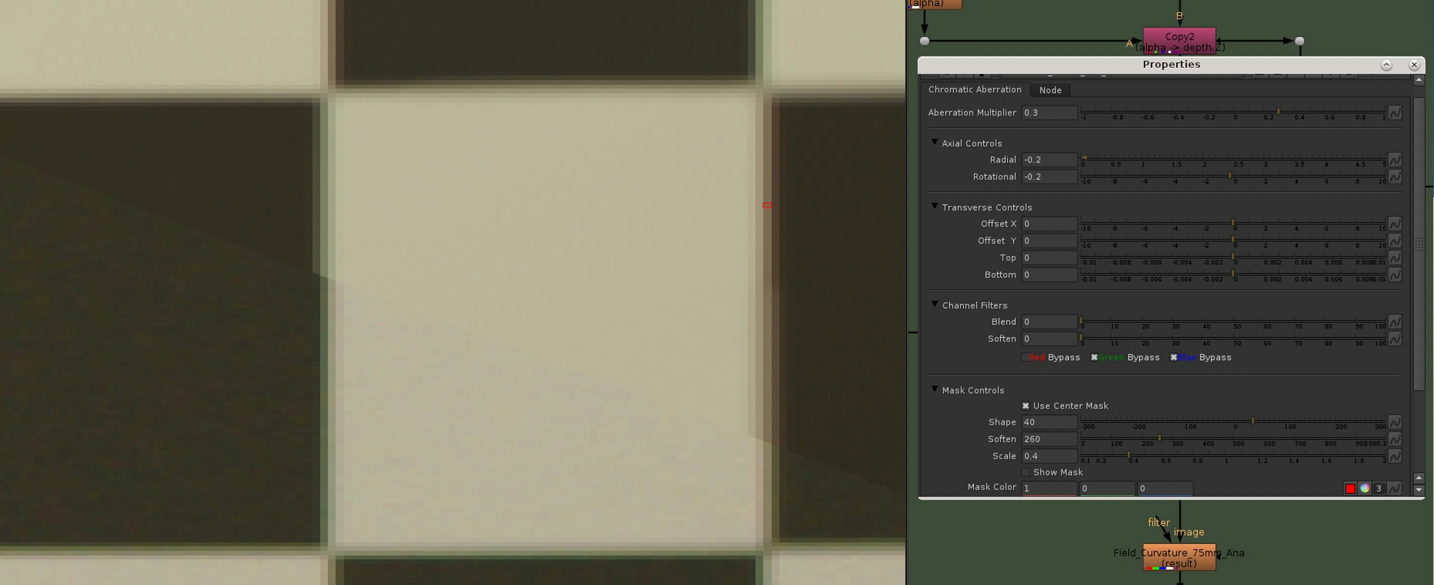 Referencing the lateral abberations at the center of the shot lens grid, I am dialing in the right amount with the transverse controls in the gizmo.