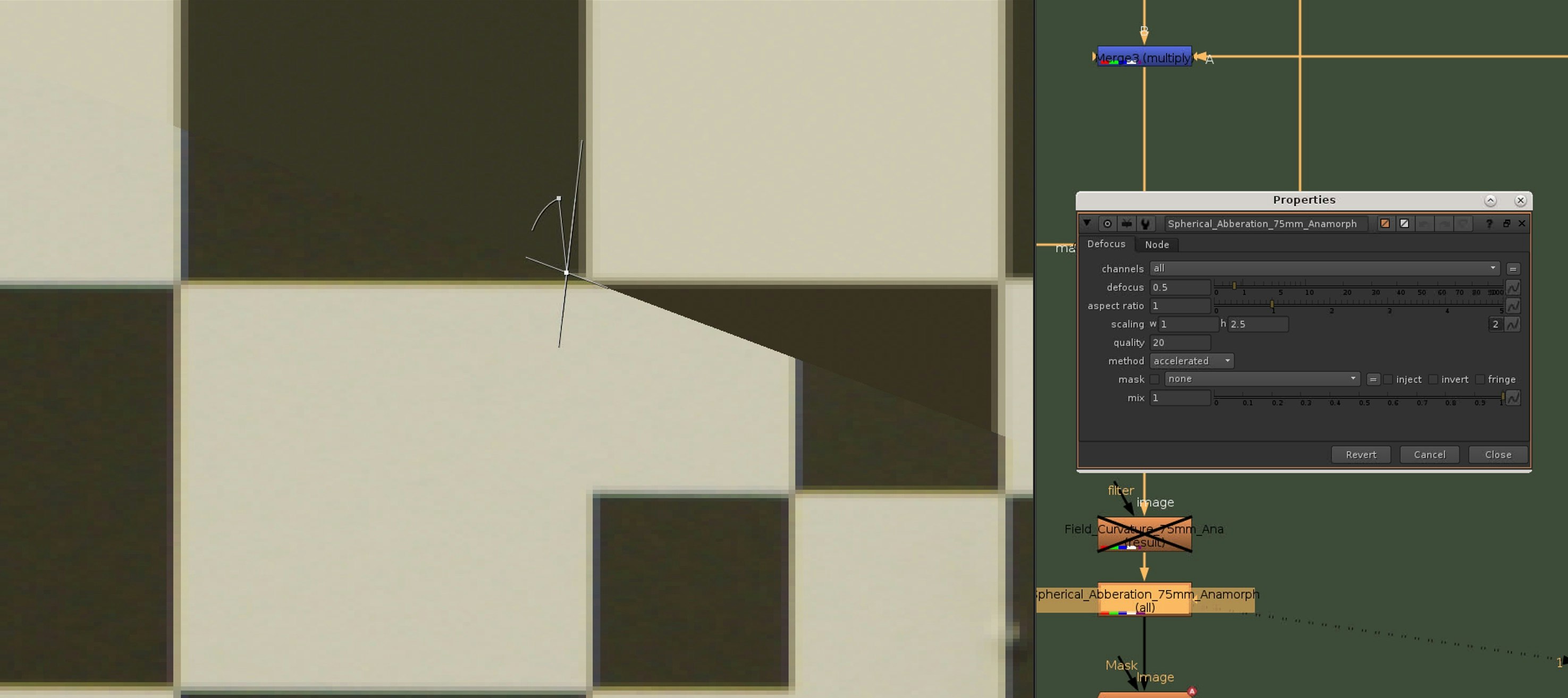 We can now dial in the defocus of our checkerboard edges with a Z-Defocus node, comparing between the Nuke checkerboard and the lens grid.